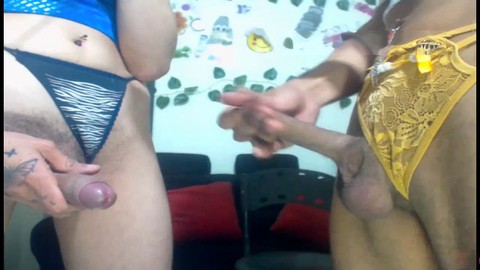 Eager Latina shemales playing with their huge dicks in live webcam show part four
