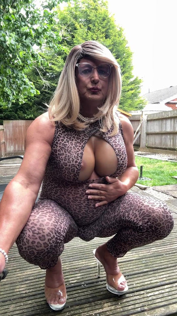 Sexy transvesthemd kellycd2022 in Catsuit und High Heels mit Leopardendruck